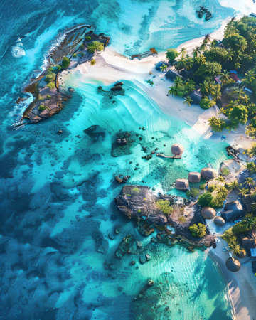 A breathtaking aerial view of a tropical island, with white sandy beaches and clear blue lagoons.