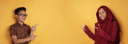 Asian muslim girl and boy pointing each other against yellow background with copy space between them