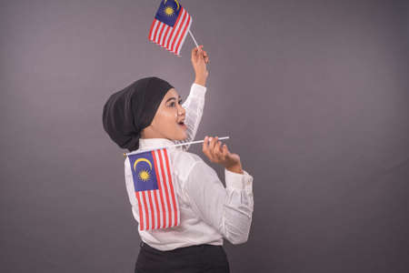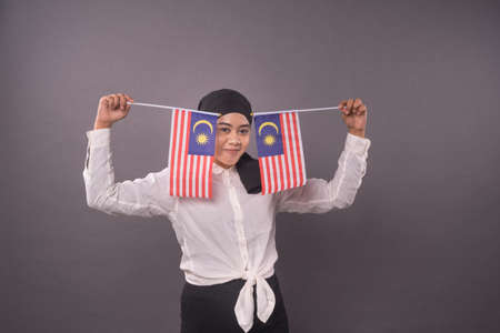 Happy Malaysian girl holding Malaysia Flag.Independence Day and patriotic concept.Studio shot.