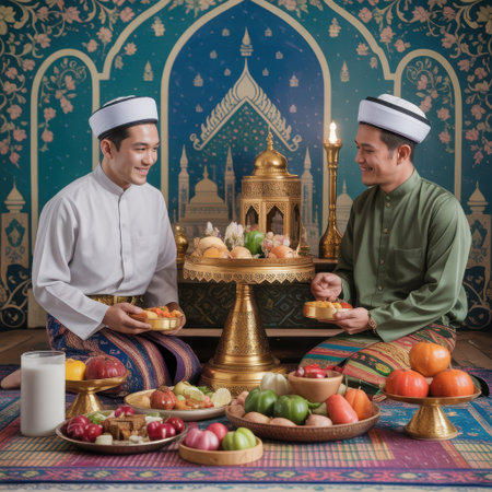 This image captures a moment of celebration as two men, dressed in traditional Islamic attire including kufi caps, share a bountiful spread of fruits and delicacies. The setting is richly decorated with intricate patterns and glowing lanterns, suggesting a joyous occasion like Eid al-Fitr or another significant cultural event. Their expressions suggest warmth and camaraderie as they partake in the festivities and food.