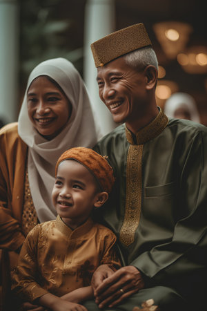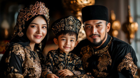 family dressed in stunning traditional attire joyfully poses for special Eid al Fitr gathering home. Lanterns and gold accents enhance festive atmosphere.