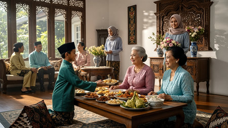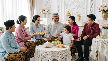 a happy smiling malay family celebrate hari raya inside living room - ai