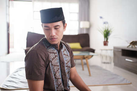 Portrait of a handsome young asian muslim man wearing traditional clothes