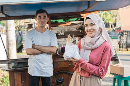 muslim woman ordering chicken satay from small food cart seller. sate ayam street food