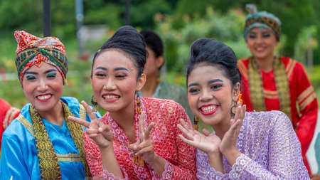 TIMISOARA,ROMANIA-JULY 4, 2019:Expressions of dancer women from Indonesia in traditional costume present at the international folk festival,International Festival of hearts,organized by the City Hall.