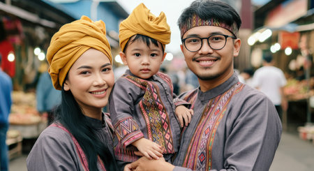 A joyful malay family of four dressed in traditional attire, smiling at the camera