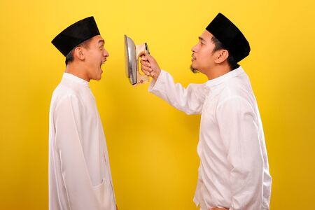 Two Young Funny Asian Muslim men ironing face, standing over yellow background
