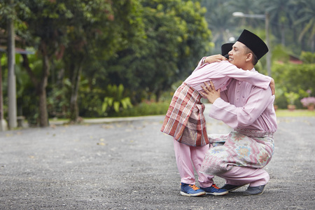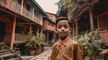 A Malay boy in Malay traditional cloth showing his happy reaction after received money pocket during Eid Fitri or Hari Raya celebration.
