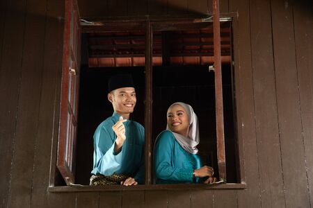 malay young couple at the wooden window of a traditional malay house-male with hand gesture love