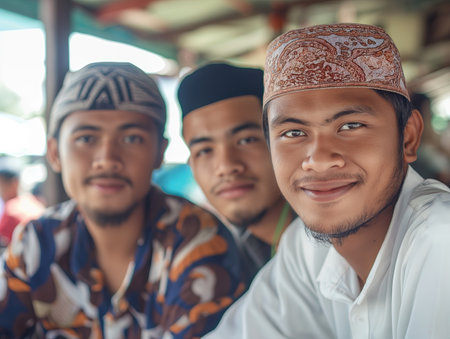 Three young men in traditional attire smiling warmly at the camera. Casual setting and natural lighting create a friendly, cultural atmosphere.