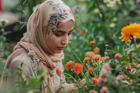 A woman wearing a head scarf is tending to a garden of flowers. The flowers are yellow and pink, and the woman is smiling as she works. Concept of peace and tranquility