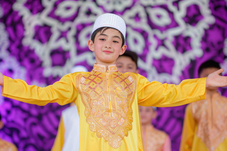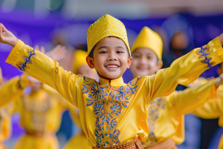 A vibrant scene showcasing enthusiastic dancers wearing colorful traditional costumes. Their joyful expressions reflect cultural celebration and artistic heritage.
