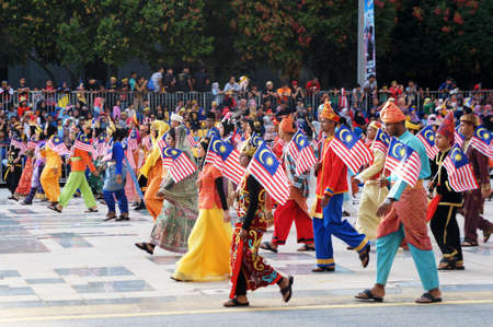 PUTRAJAYA, MALAYSIA -AUGUST 31, 2019: Teenagers wearing Malaysian ethnics and tribes traditional cloth marching on the road while holding Malaysian state flags.