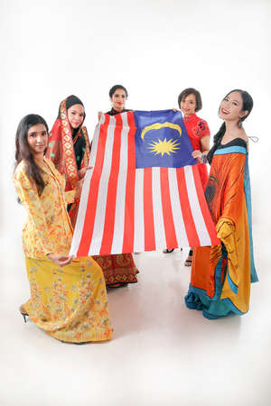 South east Asian Malay Chinese Indian race ethnic origin woman wearing dress costume baju kurung cheongsam samfu kebaya Sharee multiracial community holding Malaysian flag Jalur Gemilang on white background