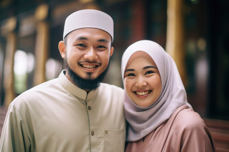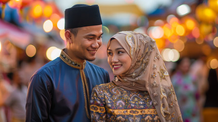 A happy Muslim couple in traditional attire enjoying a festive event with colorful lights in the background