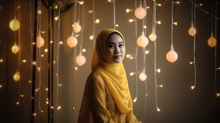 Portrait of beautiful muslim woman wearing hijab with Christmas lights on background