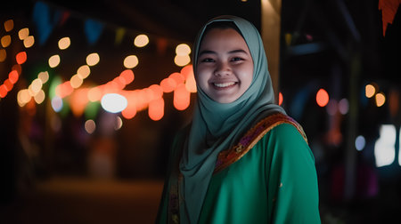 Portrait of beautiful young Asian muslim woman with hijab smiling at night