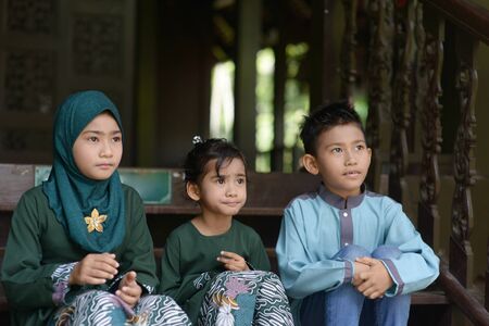 Muslim children sitting and looking away, Hari raya eid al-fitr concept.
