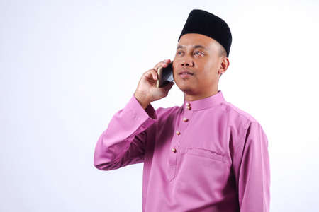 Man in traditional clothing with smartphone celebrate Eid Fitr.