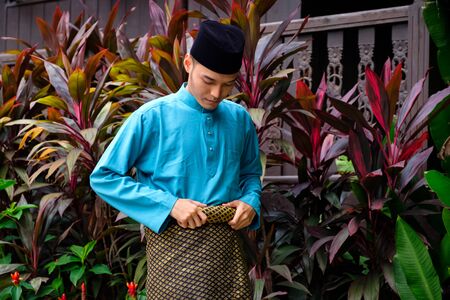 A portrait of handsome Asian Malay man wearing a blue traditional Baju Melayu with songkok on head and kain sampin on waist during the Eid Aidilfiitri celebration. Selective focus on object.