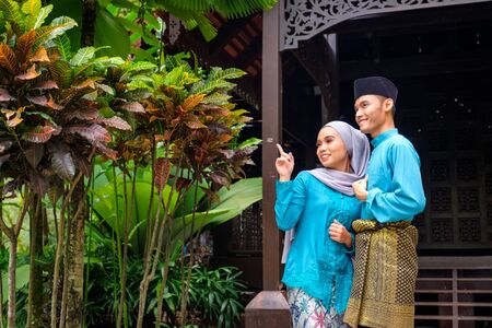 A portrait of young couple of malay muslim in traditional costume showing romantic gesture during Aidilfitri celebration. Man adjusting his girlfriend hijab. Raya and Muslim fashion attire concept.