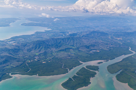 Top view of the river and mountains in KILIM Geopark on a sunny day. Langkawi Island. Malaysia.