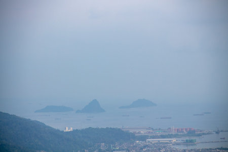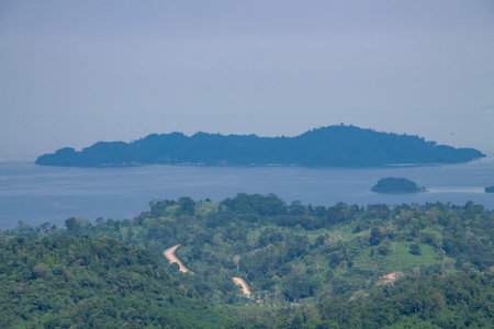 Panoramic view of blue sky, sea and mountain seen from Cable Car viewpoint, Langkawi, Malaysia. Picturesque landscape with tropical forest, beaches, small Islands in waters of Strait of Malacca
