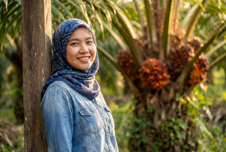 A happy young asian female farmer wearing a blue patterned headscarf and denim shirt leans against a wooden post with ripe oil palm fruit bunches visible in the blurred sunny background.