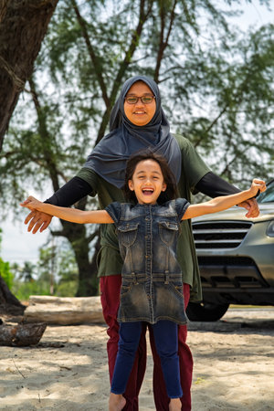 Togetherness Concept. Asian daughter playing with her mum outside park, showing her love, Mother's Day love family parenthood childhood concept