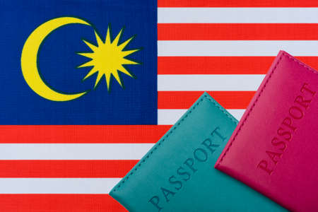 On the background of the flag of Malaysia two passports. The concept of travel and tourism.