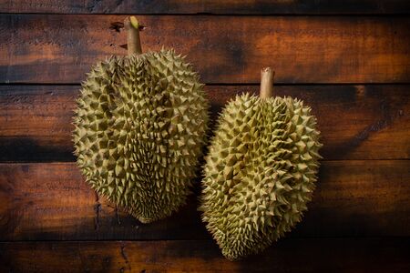 Mon Thong durian fruit on wooden plank background. Regarded by many people in southeast asia as the king of fruits.