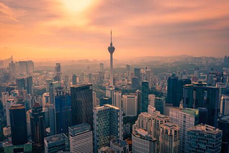 Aerial view of Kuala Lumpur city skyline at sunset in Kuala Lumpur, Malaysia.