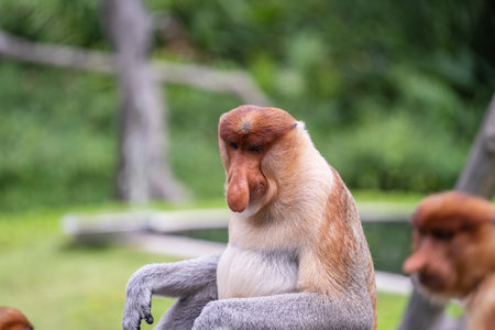 Family of wild Proboscis monkey or Nasalis larvatus or Dutch monkey, in the rainforest of island Borneo, Malaysia, close up. Amazing monkey with a massive pendulous nose