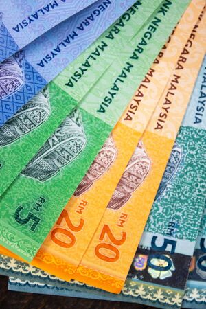 Various type of Malaysia Currency (MYR): Stack of Ringgit Malaysia bank note on dark brown a wooden table background. (There are one, five, twenty and fifty)