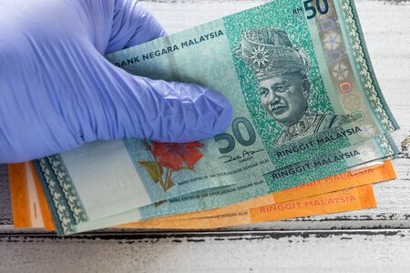 Malay money, ringgit banknotes kept in rubber gloves. The concept of economy and financial threats during the Coronavirus pandemic