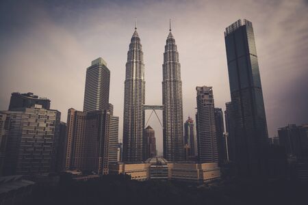 Kuala Lumpur. Petronas Twin towers and neighboring skyscrapers in golden-blue light. Modern urban metropolis in South-East Asia.