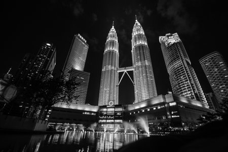 Kuala Lumpur, Malaysia - circa September 2015: Panorama of Petronas Twin Towers and Lake Symphony by night
