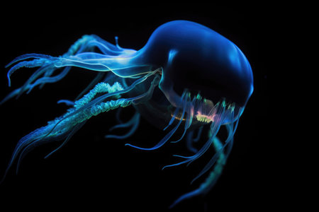 Jellyfish swimming through the dark ocean, its glowing body captured in ultra-high-definition, surreal and captivating light