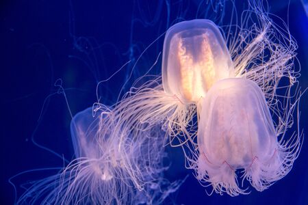Group of Sanderia Malayensis, Amakusa Jellyfish swimming in aquarium pool with blue neon light. Theriology, biodiversity, undersea life, aquatic organism