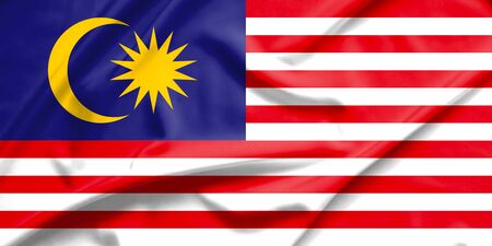 Malaysia flag waving on wind. Malaysian background fullscreen flag blowing on wind. Realistic fabric texture on elevator day.