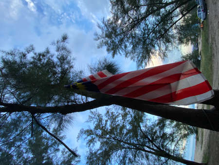 Langkawi, Malaysia - October 12, 2019. Malaysian flag at Cenang beach on langkawi