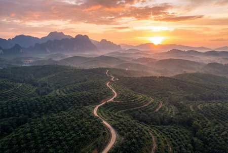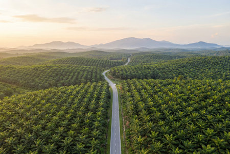Birds eye view captures sprawling palm oil plantations on undulating hills at dawn with winding road traversing dense green canopies under soft orange sunrise light in tropical agricultural region