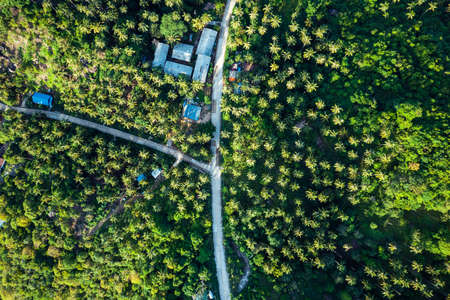 Aerial view on plantation of palm trees background, Top view aerial shot of the palm grove.