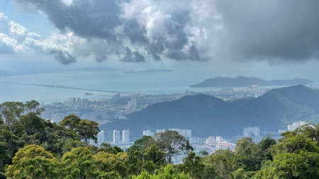 Sunny cityscape and mountain with green that viewed from Penang Hill at George Town. Penang, Malaysia.