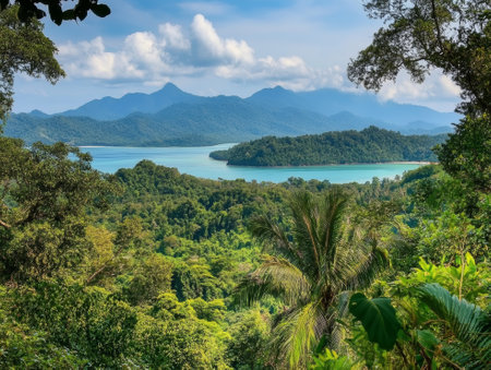 Mountain valley with green trees and shore of ocean, south asia, Malaysia