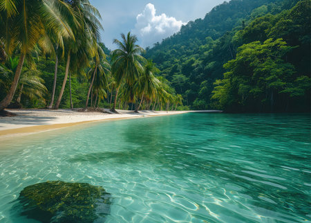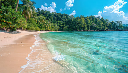 A pristine tropical beach features clear turquoise water meeting a white sand shore lined with lush palm trees and a densely forested hillside in the background during the day in South Asia.