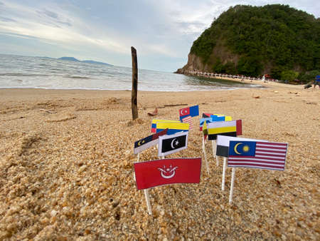 MYGIG123RF - Various flag of states of Malaysia on the sandy beach. State in Malaysia. Malaysia Day!