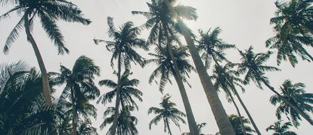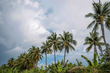 A grove of palm trees and sky with clouds in summer day on the coastline. Holidays in the tropics. High quality photo