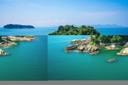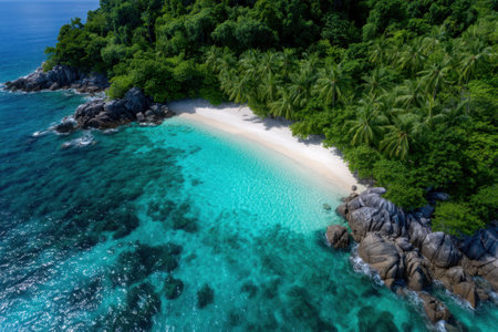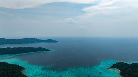 A breathtaking aerial view of a secluded Surin islands with crystal-clear turquoise waters, surrounded by lush green vegetation and corel reef. The pristine white sand and vibrant ocean hues