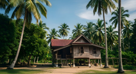 Wooden traditional Malay house in the tropical forest with coconut trees and blue sky